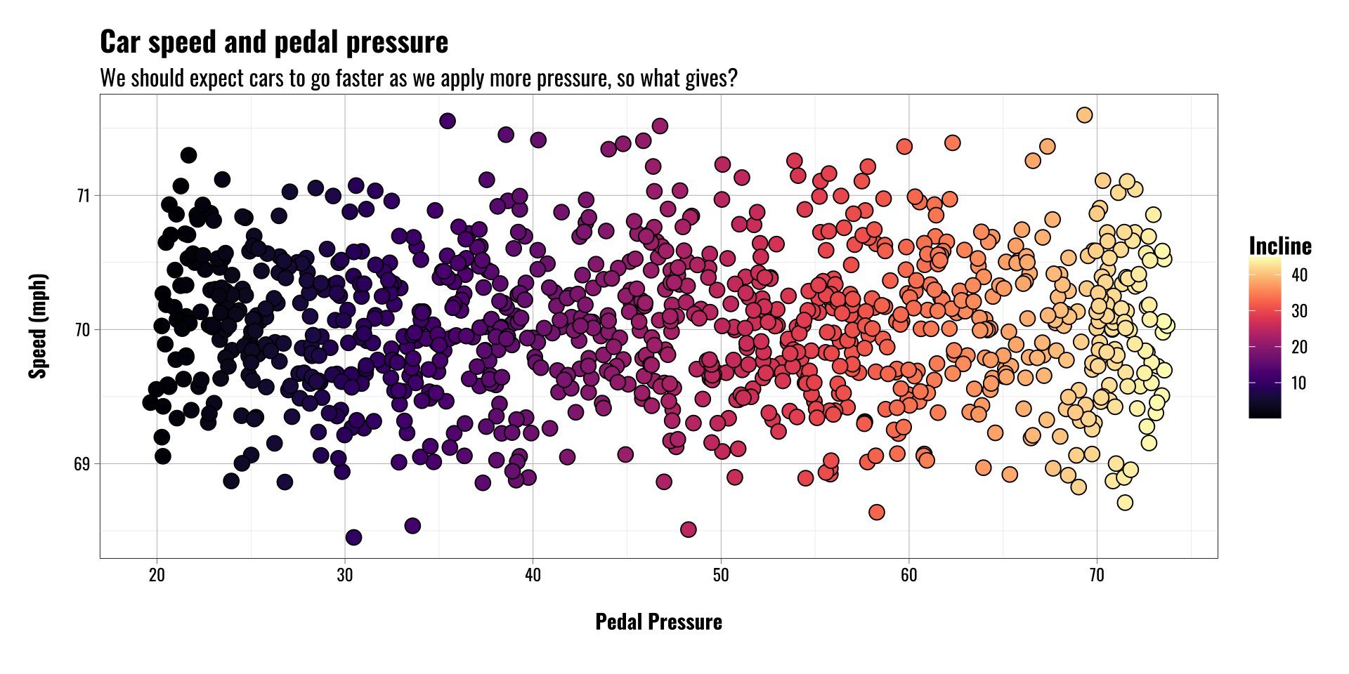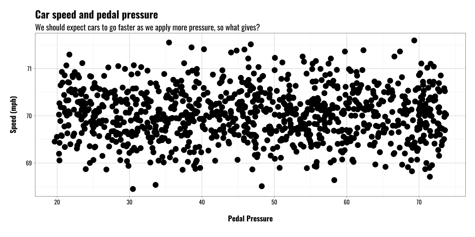 Let’s imagine we’re interested in the relationship between gas pedal pressure and speed, so we collect data on