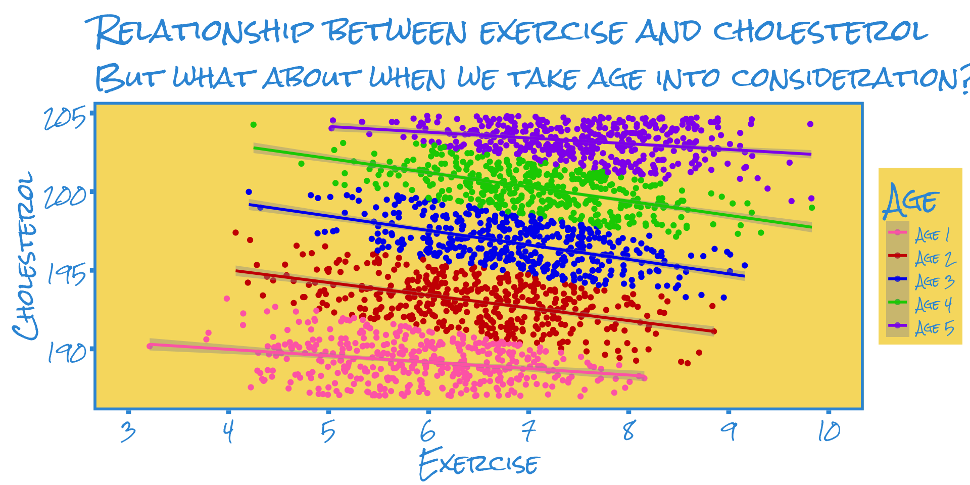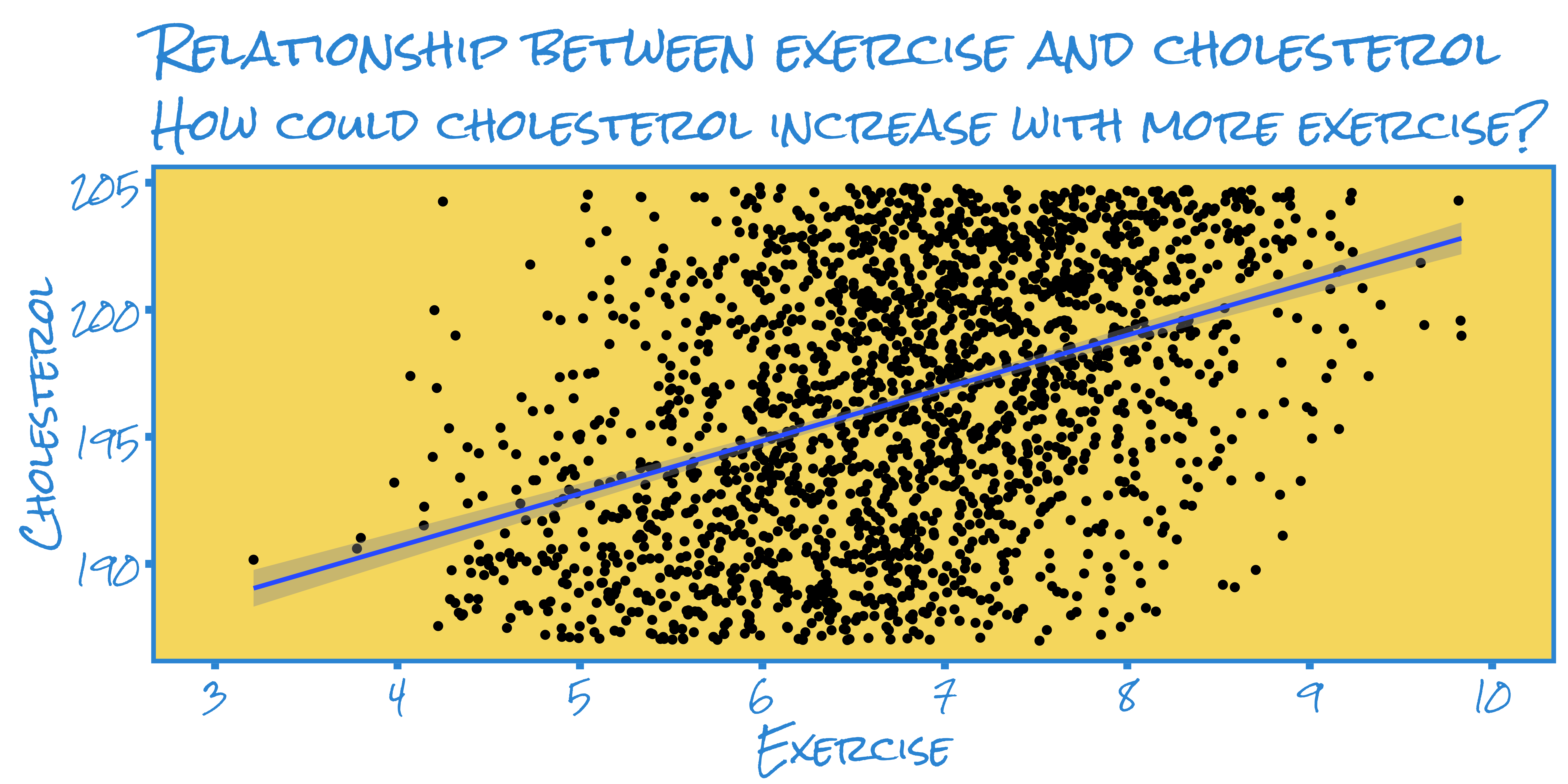 We plot the individuals’ cholesterol levels against their level of exercise (we’ll assume we directly observe this and it’s not self-reported)